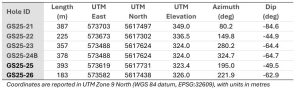 Selected intervals from holes GS25-21 through GS25-26 are summarized in Table 1 below. Note that GS25-24A is not reported as it was terminated early due to unfavourable near-surface ground conditions. GS25-24B was collared from the same pad and progressed to the target depth.