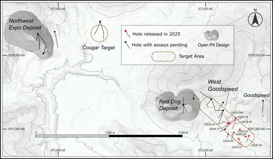As of September 30, 2025, the Company has completed 11,915 metres of drilling across 35 holes. At the West Goodspeed target and its northwestern extension toward the Red Dog area, 21 holes were completed, with results from 10 holes released in July[1] and September[2]. At the Cougar target, located approximately one kilometre east of the Northwest Expo open pit design footprint, three holes were completed and are pending assay results. In addition, two exploration holes, one at Northwest Expo and another at Goodspeed, were drilled to test extensions of nearby mineralized zones. A further nine infill holes were started at the Northwest Expo and Red Dog deposits to upgrade Inferred resources to the Indicated category as part of the ongoing pre-feasibility study (Figures 1 and 2).